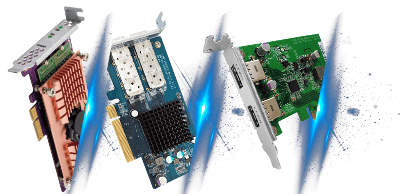 The TS-1232XU-RP provides one PCI Express (PCIe) 2.0 ×2 slot (×4 length) for expanding NAS functionality, such as installing additional 10GBASE-T ports and M.2 SSDs (both SATA and PCIe NVMe*). QNAP offers a complete array of expansion cards for you to take advantage of the TS-1232XU-RP's PCIe expandability, including QM2 expansion cards and single/dual port NICs.