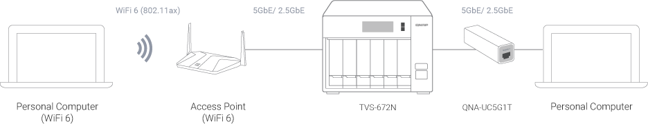 As more laptops and access points support the Wi-Fi 6 (802.11ax) standard, wireless bandwidth has greatly increased to 5GbE/2.5GbE, delivering much faster speeds than conventional Gigabit connections. Don’t let your NAS hinder your user experience – add a TVS-672N to your network environment to enhance your storage and access experience. You can also add 5GbE connectivity to your laptop with an affordable QNAP USB 3.0 to 5GbE adapter (QNA-UC5G1T) and directly connect to the TVS-672N to benefit from higher network speeds.